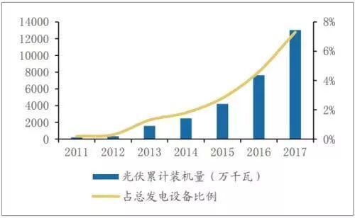 中國(guó)新增裝機(jī)容量連續(xù)五年全球D一,截至2018年4月,中國(guó)并網(wǎng)光伏裝機(jī)容量已經(jīng)超過(guò)1.4億千瓦。