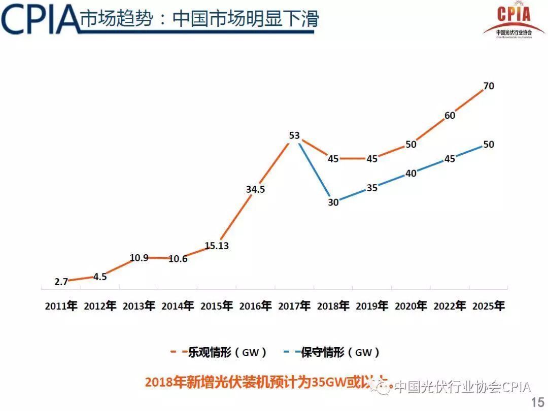 國(guó)家能源局此前發(fā)布的《太陽(yáng)能發(fā)展“十三五”規(guī)劃》明確,到2020年,全國(guó)光伏累計(jì)裝機(jī)容量的目標(biāo)為105GW。但截至2018年4月,全國(guó)裝機(jī)容量已超過(guò)140GW。中國(guó)光伏狂飆突進(jìn)背后的支撐是財(cái)政補(bǔ)貼,而補(bǔ)貼留下的財(cái)政“窟窿”,已經(jīng)悄悄把這場(chǎng)狂歡推向懸崖邊。事實(shí)上,中國(guó)光伏行業(yè)在世界上不僅勝在規(guī)模,更勝在技術(shù)快速迭代,促使原材料和光伏組件成本快速下降。新政的出臺(tái),也考慮到2018年光伏組件價(jià)格降速較快的因素:光伏組件平均價(jià)格與去年底相比降幅已達(dá)約17%。根據(jù)光伏行業(yè)“十三五”規(guī)劃,光伏業(yè)界原本期待實(shí)現(xiàn)平價(jià)上網(wǎng)為2020年。新政問(wèn)世,相當(dāng)于將這一期限提前了兩年,也意味著一場(chǎng)淘汰賽提前上演,并將比兩年后更加殘酷。